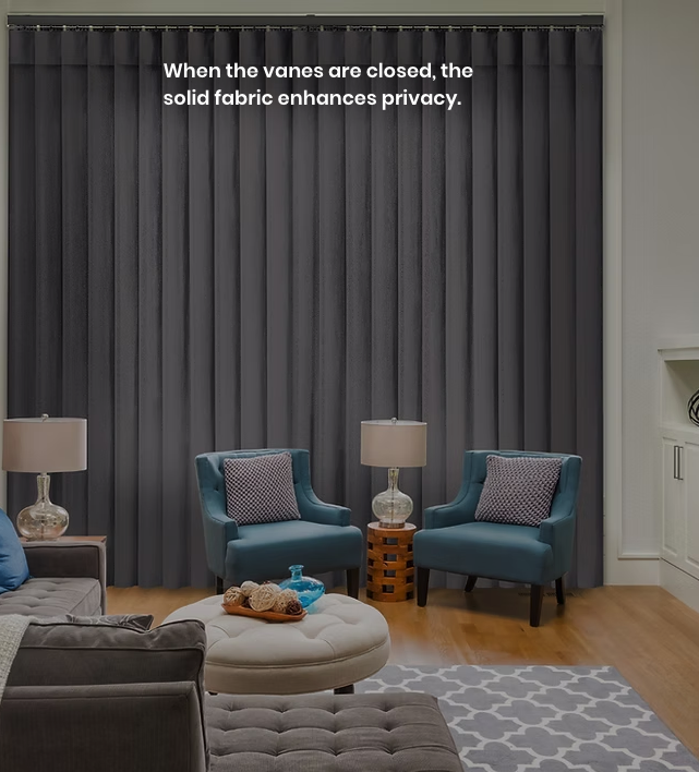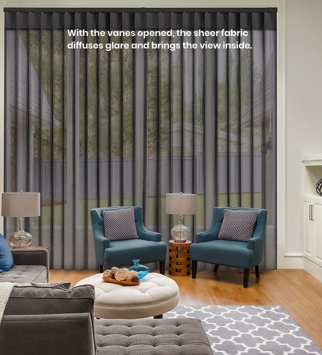 Verti-Sheer Shades combine the soft, elegant look of sheer fabric with the functionality of vertical blinds, creating a modern solution for large windows and sliding glass doors. Designed to gently diffuse natural light while maintaining privacy, these shades allow you to enjoy brightness without sacrificing comfort or control.